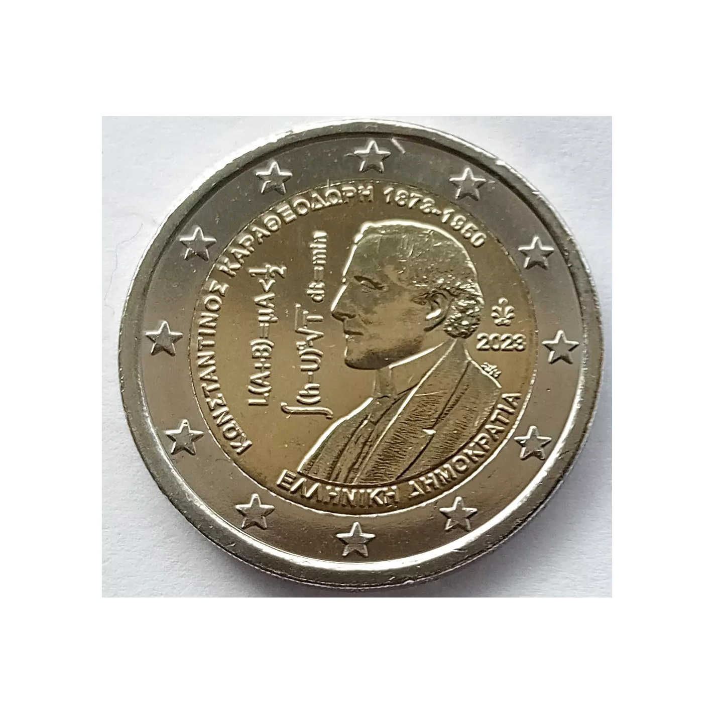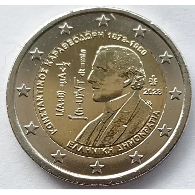 Rewers: profil Constantina Carathéodory'ego zwróconego w lewo, projektant po prawej ΣΤΑΜ; jego wzór algebraiczny w pionie po lewej, znak mennicy po prawej, data poniżej 2023. Temat i lata jego życia po lewej ΚΩΝΣΤΑΝΤΊΝΟΣ ΚΑΡΑΘΕΟΔΩPH 1873-1950 (Constantin Carathéodory), nazwa stanu na dole ⤻ ΕΛΛΗΝΙΚΗ ΔΗΜΟΚΡΑΤΙΑ (Republika Grecka). Wokół dwunastu europejskich gwiazd pięcioramiennych (skierowane do góry).