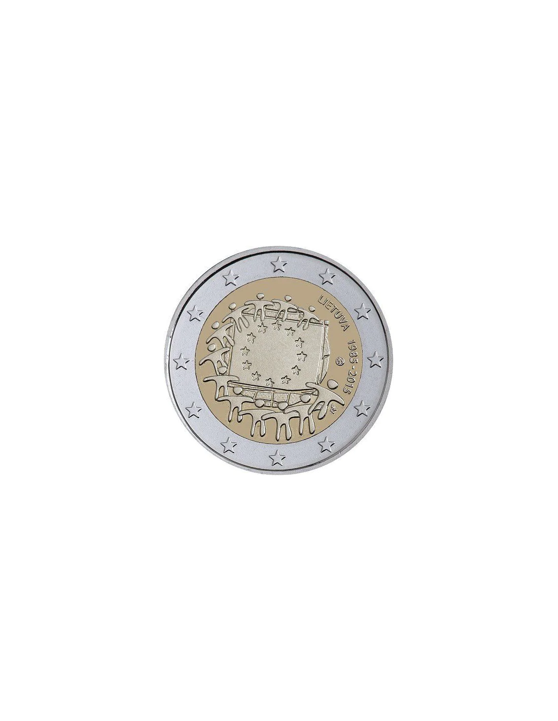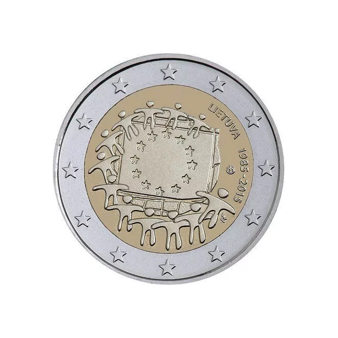 Flaga europejska to niezmiernie ważny symbol dla wspólnoty europejskiej i całego kontynentu. Używany wspólnie przez wszystkie państwa Europy przypomina o łączącej je jedności i solidarności. Dlatego w 30-lecie jego uznania wszystkie państwa strefy euro wyemitowały wspólnie okolicznościowe monety, których tematem jest właśnie flaga Unii Europejskiej i Europy. Została umieszczona na awersie projektu Georgesa Stamatopoulosa, gdzie jest trzymana przez postacie naokoło niej. Z prawej nazwa emitenta LIETUVA (LITWA), lata 1985-2015 i znak mennicy.