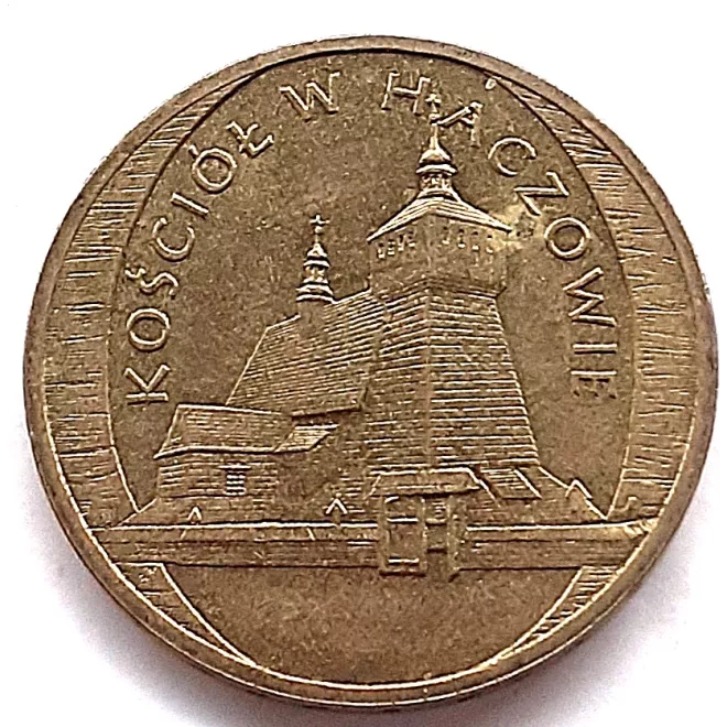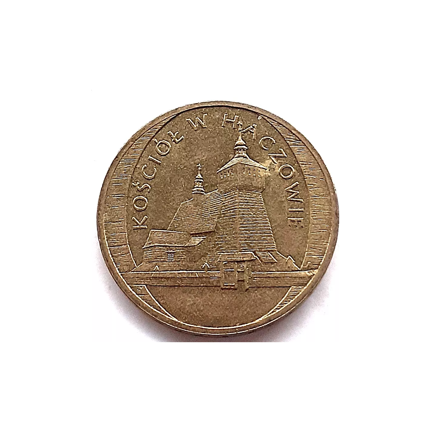 Na rewersie świątynia, a nad nią jej nazwa "KOŚCIÓŁ W HACZOWIE". Na awersie centralnie orzeł biały, ma znak mennicy MW pod łapą, dzieli rok emisji monety 2006 na dwie części, na dole nominał "zł 2 zł", a u góry nazwa emitenta RZECZPOSPOLITA POLSKA.