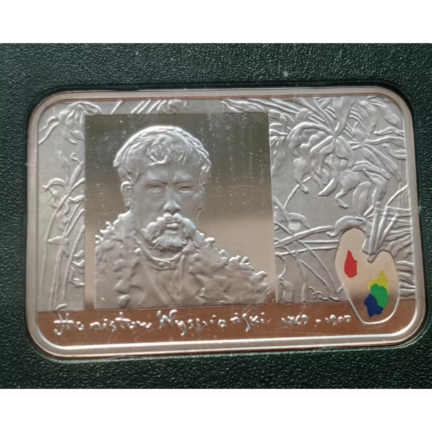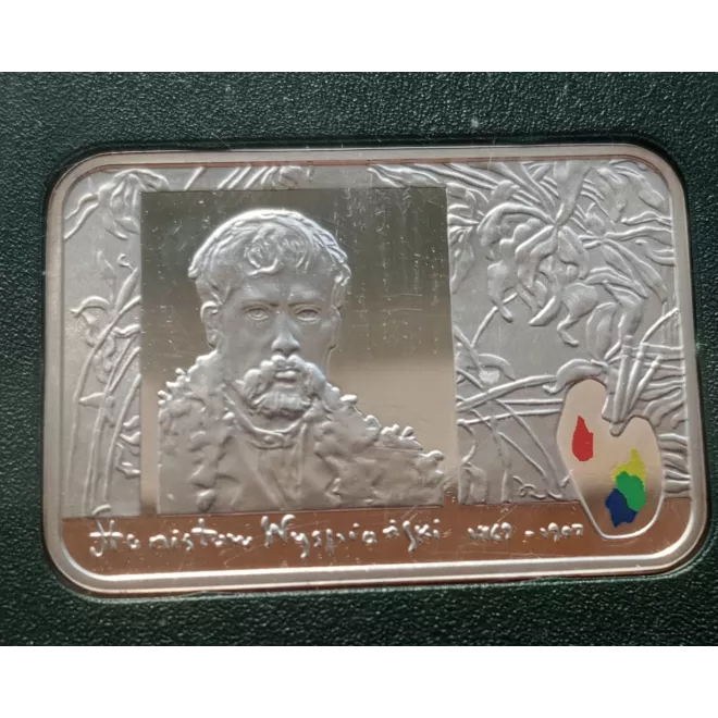 Rewers: Stylizowany wizerunek obrazu „Autoportret” Stanisława Wyspiańskiego z 1902 r. U dołu napis: Stanisław Wyspiański 1869-1907. W prawym rogu paleta z trzema pędzlami. Na palecie farby: czerwona, żółta, zielona i niebieska.