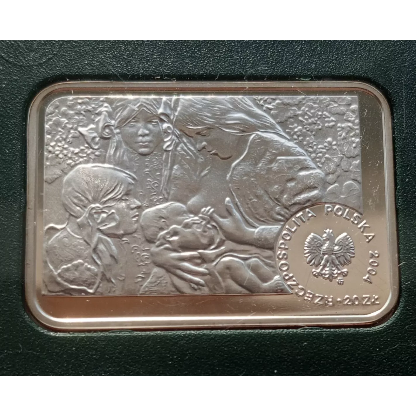Awers: Stylizowany wizerunek obrazu Stanisława Wyspiańskiego 'Macierzyństwo". U dołu z prawej wizerunek orła. Dookoła orła napis: RZECZPOSPOLITA POLSKA, oznaczenie roku emisji: 2004,nominał 20 ZŁ oraz znak menniczy pod lewą łapą orła