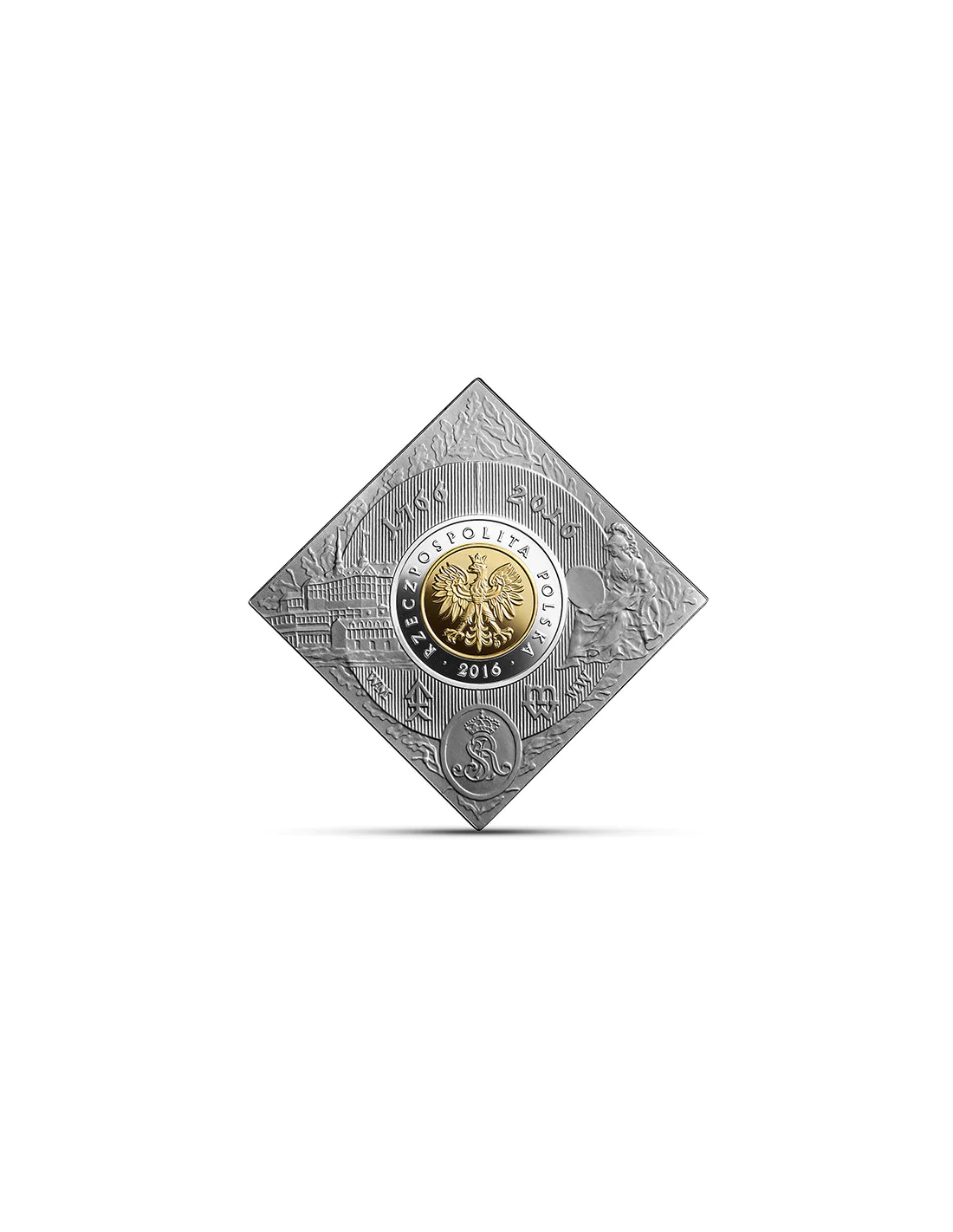 Oryginalna, kwadratowa moneta kolekcjonerska. W centrum rewersu widnieje typowa, obiegowa 5-złotówka. Naokoło niej popiersie Stanisława Augusta Poniatowskiego znane przede wszystkim z monet i medali oraz napisy "250 ROCZNICA ZAŁOŻENIA MENNICY WARSZAWSKIEJ". Na awersie centralnie awers obiegowej monety 5-złotowej z oznaczeniami emitenta RZECZPOSPOLITA POLSKA, rok emisji 2016 i godło orzeł biały ze znakiem mennicy pod łapą. Naokoło kompozycja stworzona z Zamku Królewskiego w Warszawie, opiekunki rzemiosła Minerwy i lat "1766-2016" Obie strony monety mają również wiele symboli nawiązujących do lat działań mennicy i wybijanych tam przedmiotów.