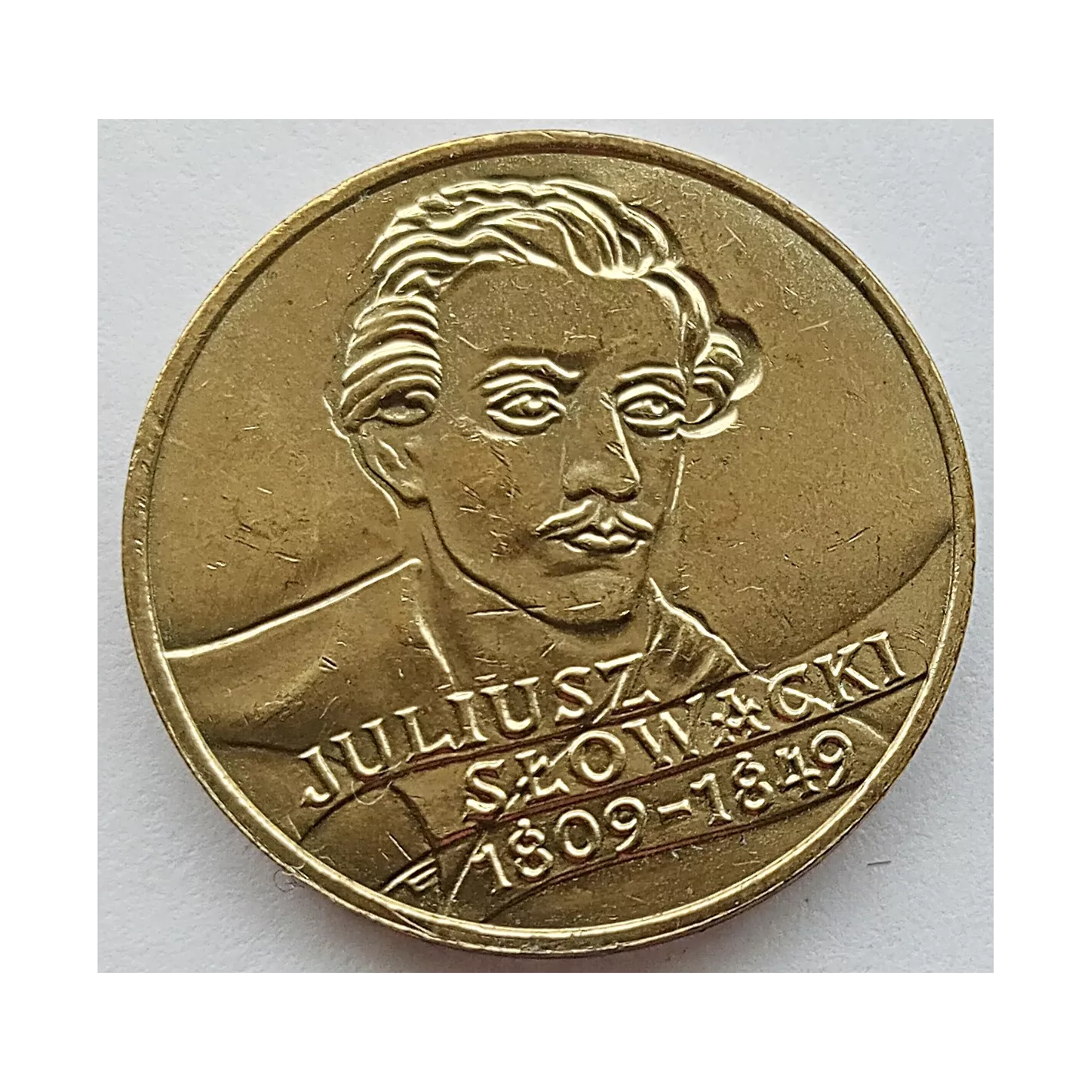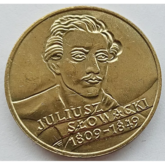Juliusz Słowacki obok Adama Mickiewicza i Zygmunta Krasińskiego należy do tzw. Trójcy Wieszczy Narodowych. W uznaniu jego twórczości w 150 rocznicę śmierci pisarza została wyemitowana moneta z jego wizerunkiem na rewersie. Poniżej jego imię i nazwisko "JULISZ SŁOWACKI" oraz lata życia 1809-1849. Na awersie pośrodku orzeł biały z oznaczeniem menniczym pod łapą. Po bokach rozdzielony rok emisji monety 1999. Poniżej nominał "zł 2 zł", a powyżej RZECZPOSPOLITA POLSKA.