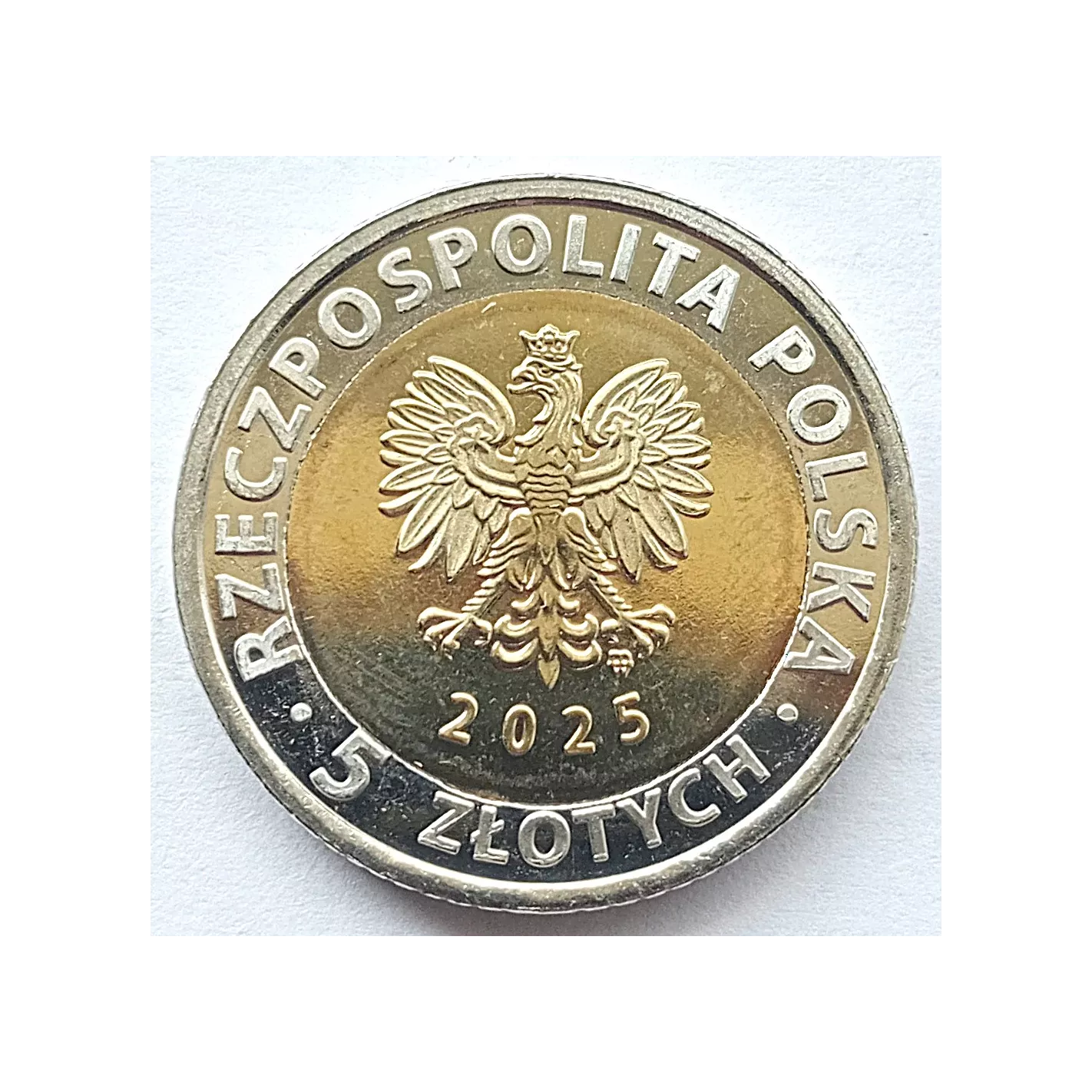 Awers: W centralnym okręgu orzeł polski, znak mennicy mw (Mennica Warszawa), data poniżej 2025. Nazwa kraju wokół RZECZPOSPOLITA POLSKA , nominał u dołu • 5 ZŁOTYCH •