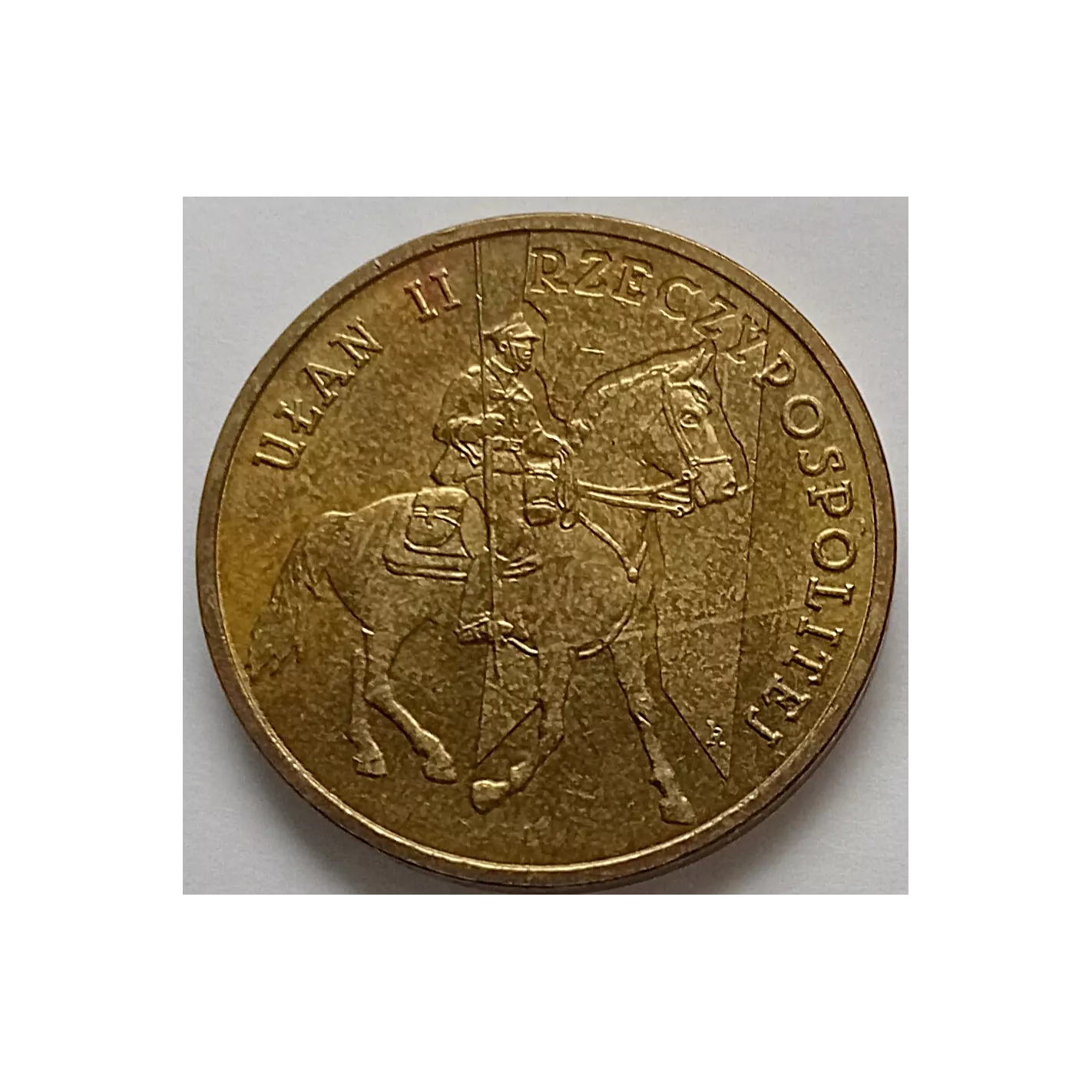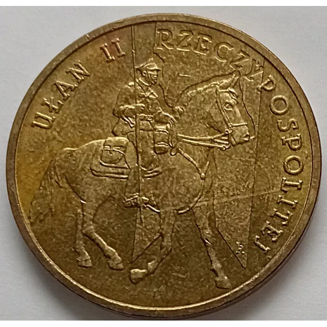 Na rewersie kawalerzysta na koniu, a od góry biegnie tematyczny napis "UŁAN II RZECZPOSPOLITEJ". Na awersie godło Rzeczpospolitej Polskiej i jej nazwa nad nim. Orzeł dzieli rok emisji monety 2011 na 2 części, pod łapą ma znak mennicy MW, a pod nim jest nominał "zł 2 zł".