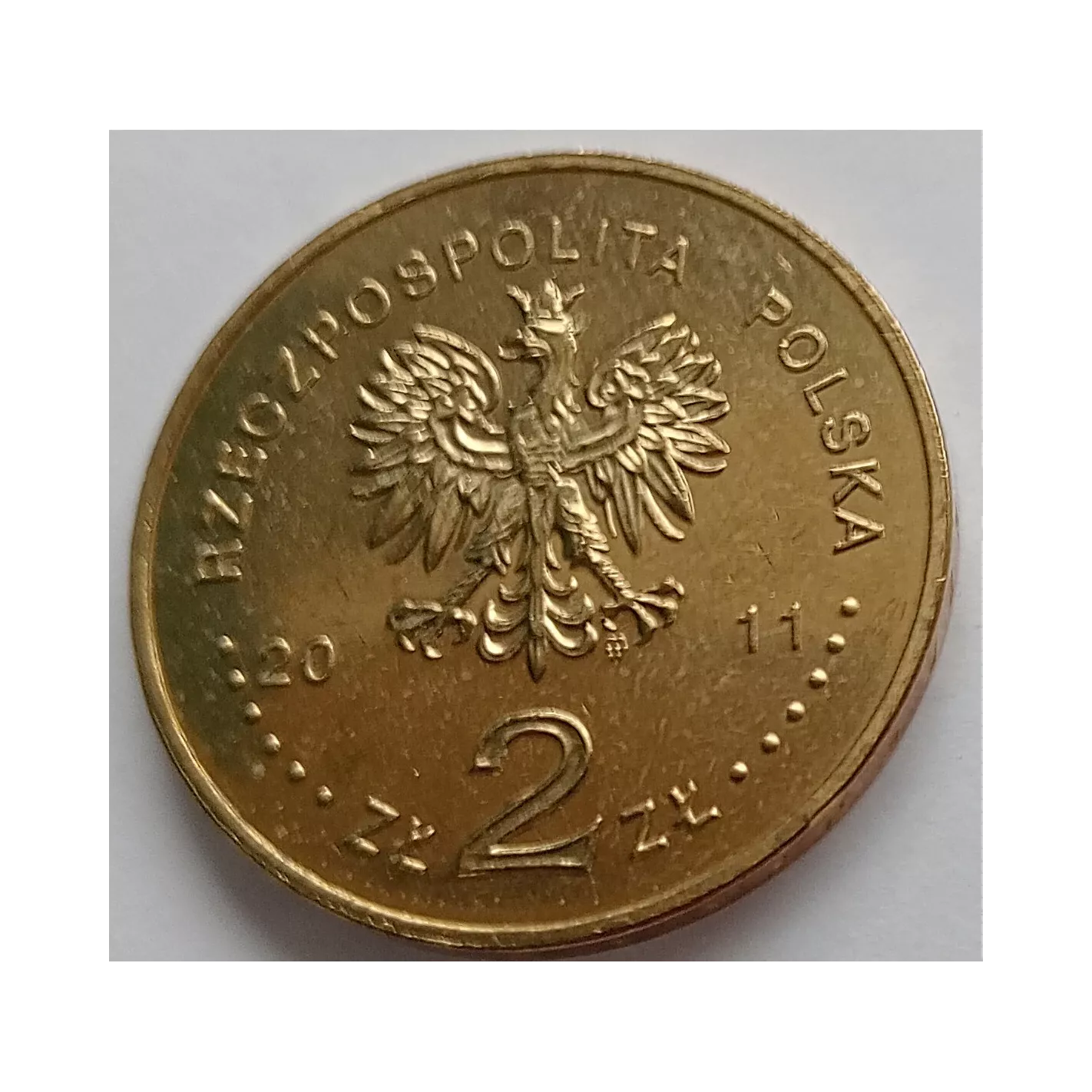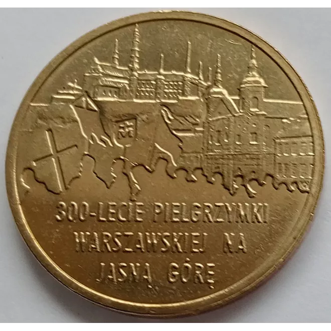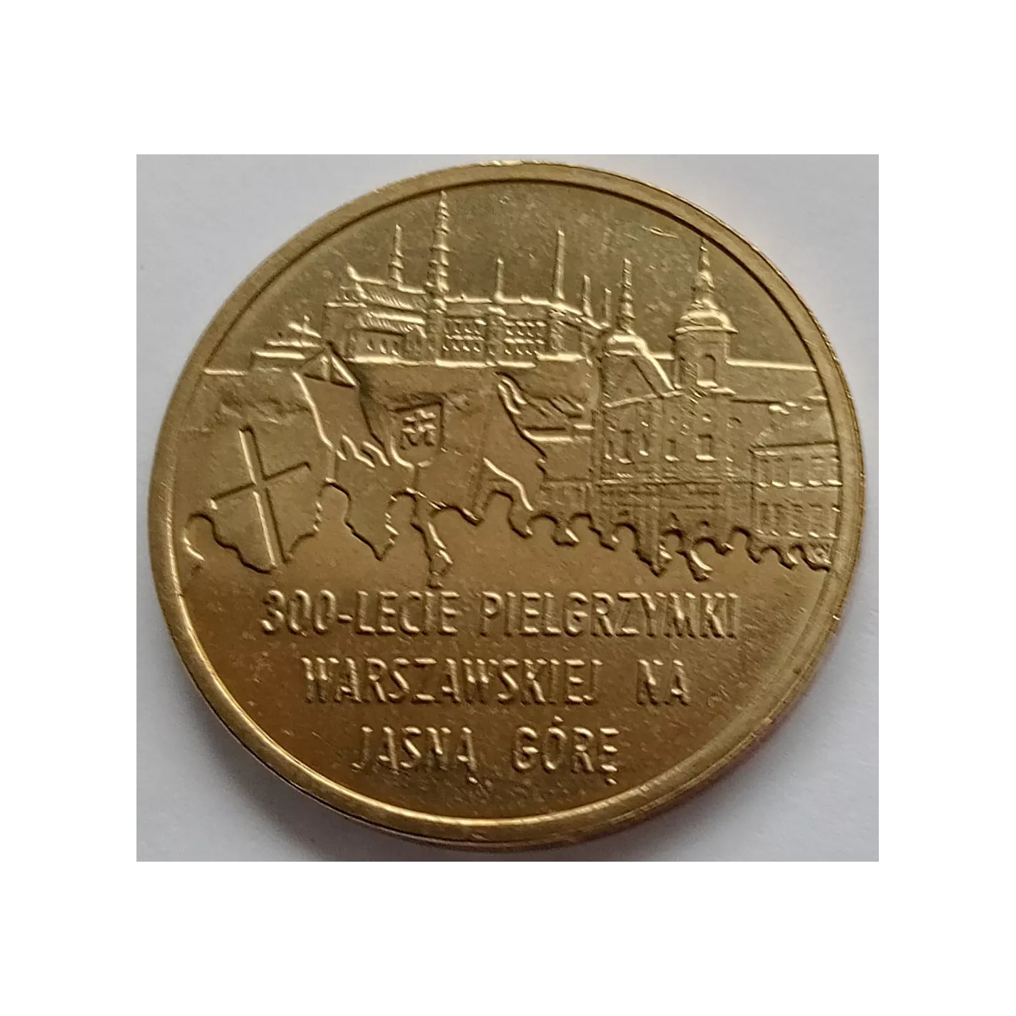 Na rewersie widnieje częstochowska Jasna Góra z zakonem paulinów. Poniżej pielgrzymi niosący krzyż, a pod nimi napis tematyczny "300-LECIE PIELGRZYMKI WARSZAWSKIEJ NA JASNĄ GÓRĘ". Na awersie godło RP, jej pełna nazwa RZECZPOSPOLITA POLSKA, znak mennicy MW, nominał "zł 2 zł" i rok emisji 2011.