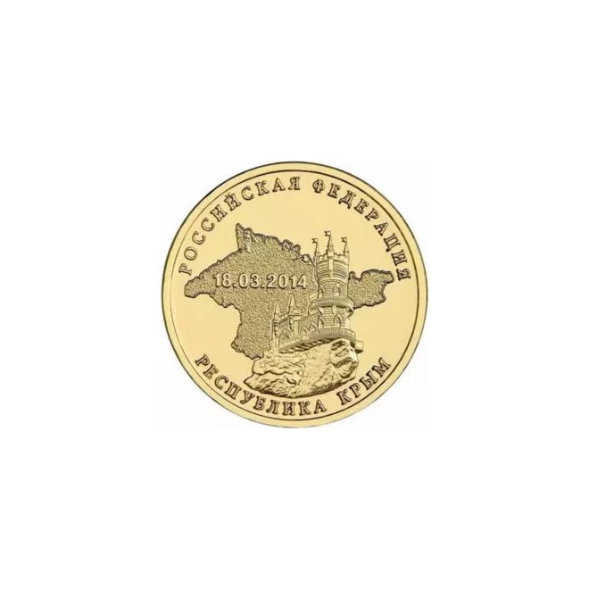 Rewers: na tle kontr-zarysów Półwyspu Krym w centrum – data „18.03.2014”, po prawej – płaskorzeźba pomnika architektonicznego „Jaskółcze Gniazdo” w pobliżu Gaspry, w otoku napisy, powyżej: „РОССИЙСКАЯ ФЕДЕРАЦИЯ” (Federacja Rosyjska), poniżej: „РЕСИЙКА КРЫМ” (Republika Krymu).