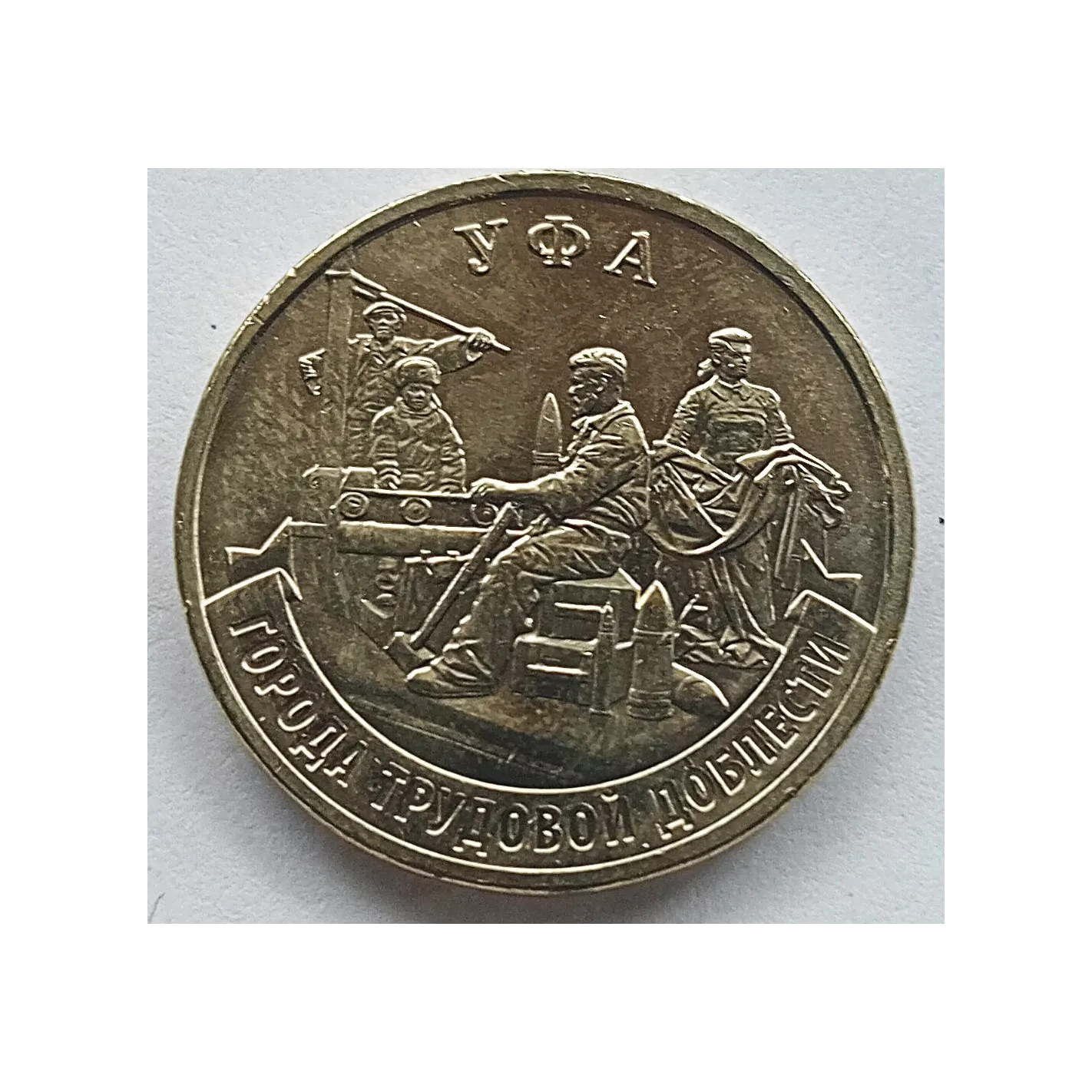 Rewers: Fragment pomnika robotników frontu wewnętrznego. Miasto u góry УФА (Ufa), nazwa serii na wstążce u dołu ГОРОДА ТРУДОВОЙ ДОБЛЕСТИ (Miasta męstwa pracy).