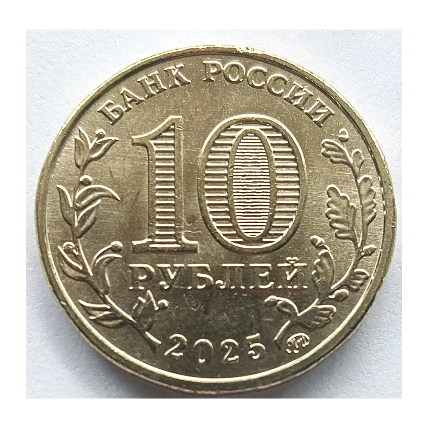 Awers: na środku krążka - oznaczenie nominału monety „10 РУБЛЕЙ” (10 rubli). Wewnątrz cyfry „0” - ukryte zdjęcia cyfry „10” i napisu „РУБ” (RUB) widoczne na zmianę przy zmianie kąta widzenia. W otoku koliste napisy, u góry: „БАНК РОССИИ” (Bank Rosji), u dołu data: „2025”, z lewej stylizowany wizerunek gałązki wawrzynu, z prawej strony dębu .