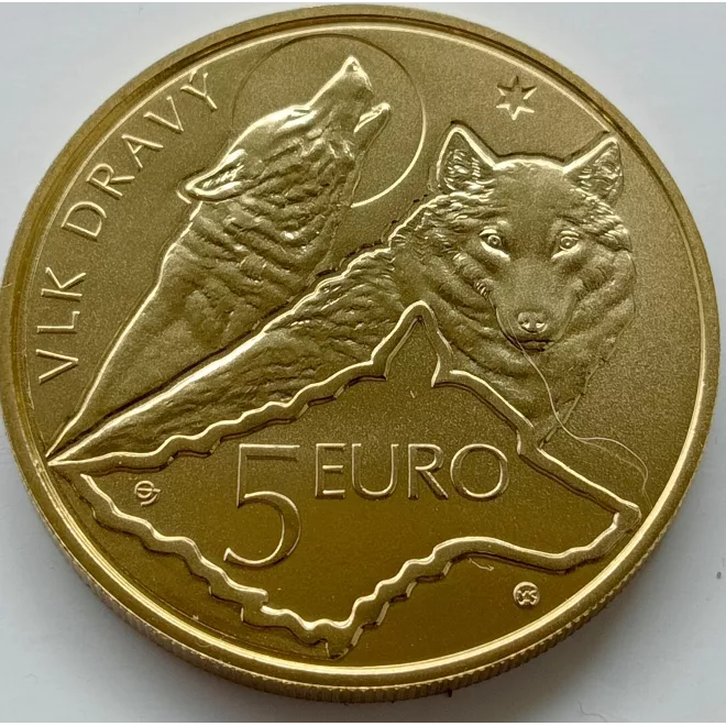 Rewers: Wilk wyje do księżyca, inny patrzy prosto przed siebie znak mennicy, wartość nominalna 5 EURO, Temat VLK DRAVÝ (Wilk drapieżny)