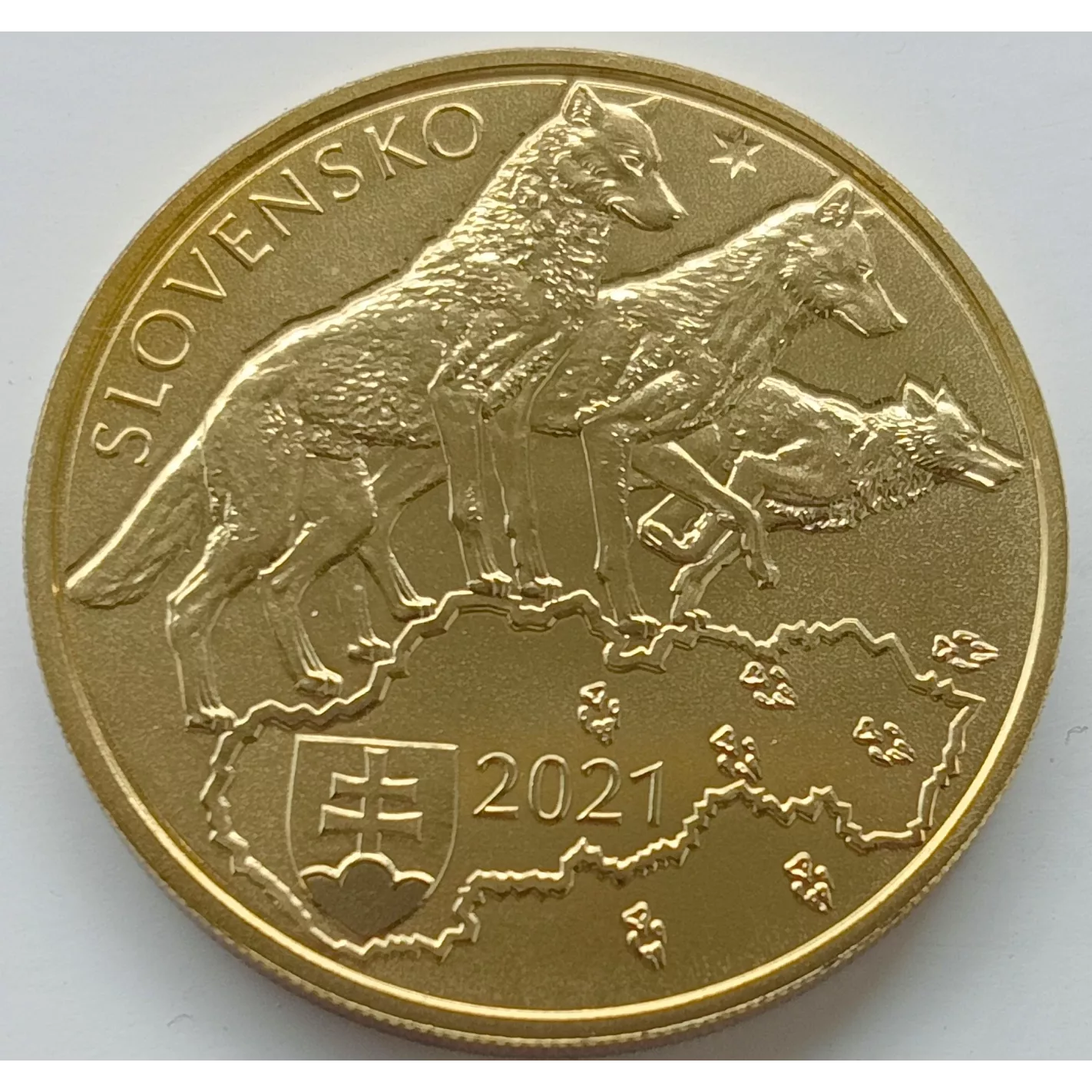 Awers: Trzy wilki i ich ślady na mapie Słowacji, mały herb narodowy i data 2021, nazwa kraju SLOVENSKO
