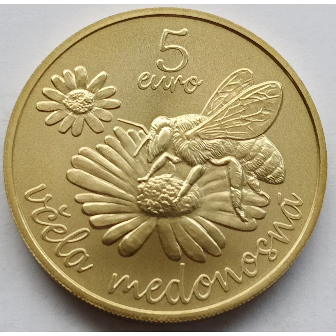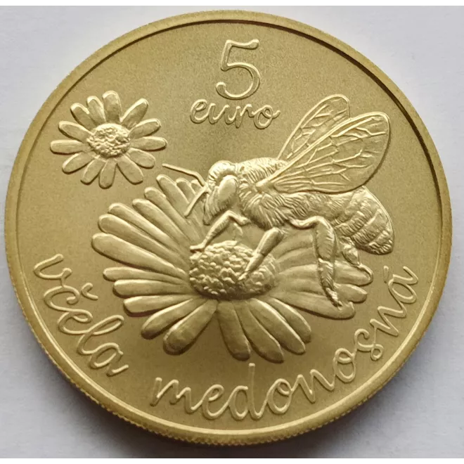 Rewers: Pszczoła siedząca na kwiecie, wartość „5 / euro”, Temat; „Včela medonosná” (Pszczoła miodna)