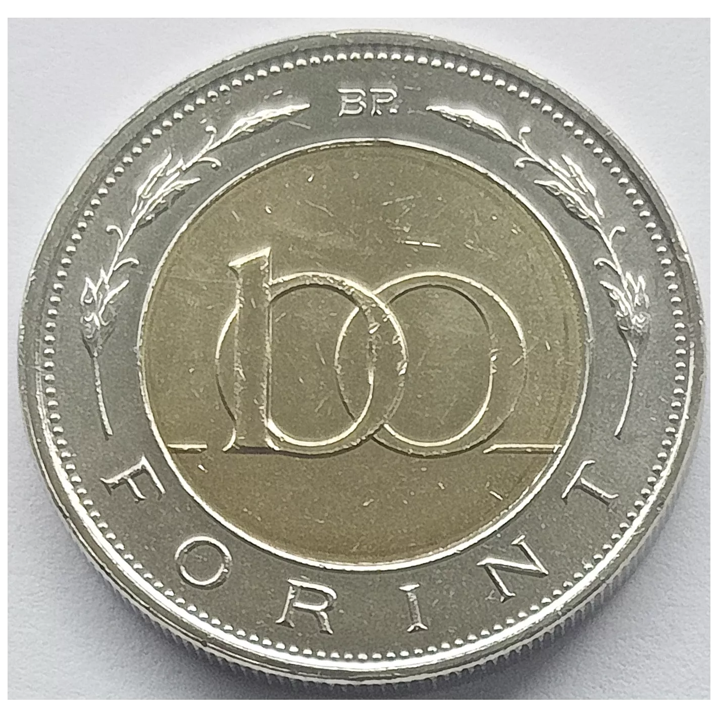 Awers: W centralnym okręgu nominał 100. Znak mennicy u góry BP. Rośliny po bokach, u dołu symbol waluty FORINT.
